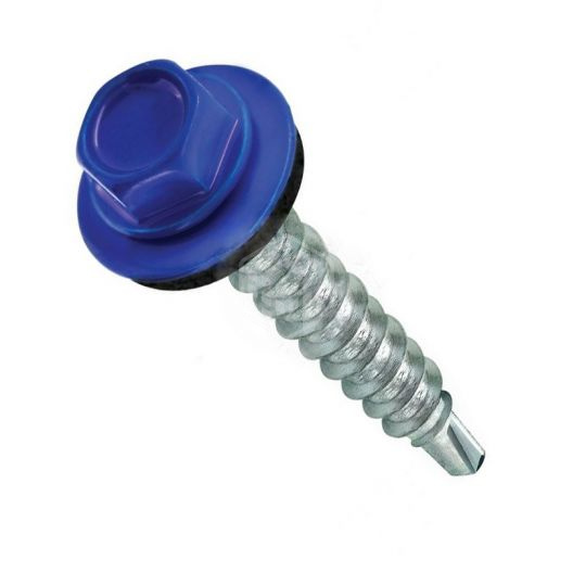 Саморез кровельный, синий, 5,5х19 мм, 250 шт, Тайвань для соединения кровельных материалов (металлочерепицы и профнастила) с металлическими или деревянными каркасами стен и крыш. Саморез представляет собой шуруп с шестигранной головкой в комплекте с шайбой и резиновой прокладкой, способной выдержать воздействие внешних условий окружающей среды и обеспечивающую гидроизоляцию крепления. Изготавливаются саморезы из стали с цинковым покрытием.