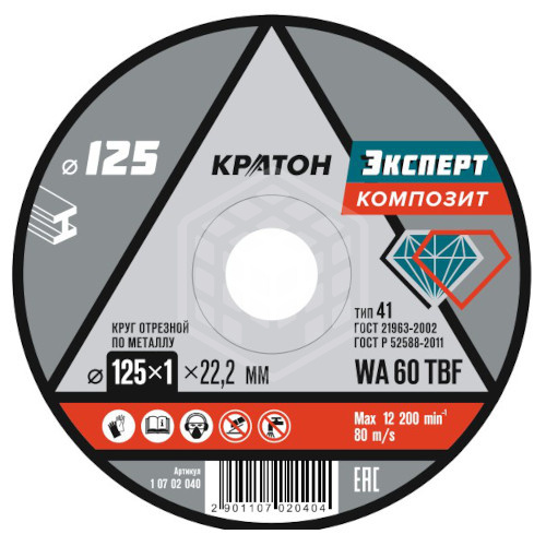 Характеристики товара Диск отрезной по металлу Кратон Эксперт, WA 60 4TBF, 125х1х22,2 мм