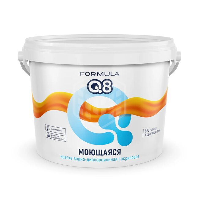 Краска моющаяся FORMULA Q8, белоснежная, 2,7 кг для работ внутри помещения. После высыхания образует матовую поверхность. Без резкого запаха. Наносится без потёков и разбрызгивания. Выпускается белого цвета. Тонируется в пастельные тона колерами для водно-дисперсионных материалов.Экологически чистая. Отделка отделки стен, потолков и элементов строительных конструкций в помещениях, подверженных воздействию влаги или требующих мытья: ванные комнаты, кухни, подвалы, подъезды, гаражи и т.д. Наносить на оштукатуренные, кирпичные, бетонные, деревянные, гипсокартонные, бумажные, ДВП, ДСП и другие основания, кроме металлических.