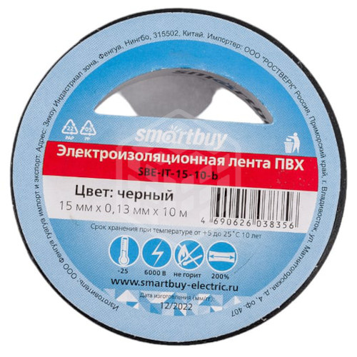 Изолента Smartbuy, 15 мм, 10 м, черная SBE-IT-15-10-b