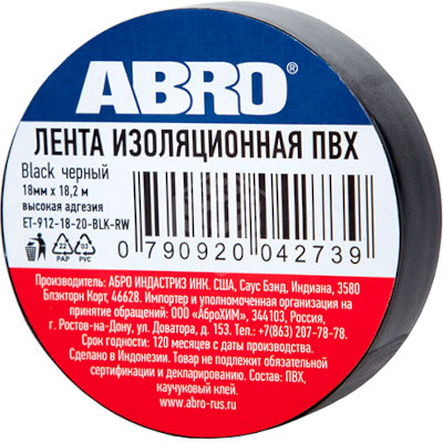Характеристики товара Изолента ABRO ET 912, черный, 19 ммх 18,2 м