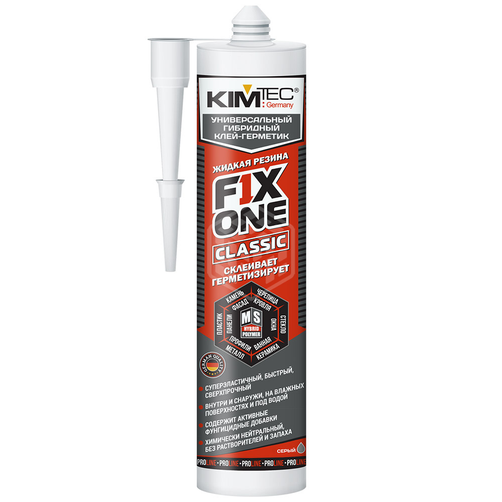 Клей-герметик KIM TEС FIX ONE, серый, 475 г Применяется для решения разнообразных задач при строительно-монтажных и ремонтных работах в быту, в производстве и промышленности. Эластичное склеивание и герметизация широкого спектра материалов внутри и снаружи зданий и сооружений. Герметизация и уплотнение соединительных и компенсационных швов и стыков в фасадных элементах и конструкциях, подверженных высоким динамическим нагрузками и вибрациям. Ремонт кровельных, водосточных и водопроводных систем. Уплотнение швов в стеновых и изоляционных панелях, порогах, подоконниках, декоративных планках. Герметизация в помещениях с повышенной влажностью - ванные комнаты, санузлы, кухни, душевые, прачечные, моечные, бани и сауны. Склеивание и герметизация облицовочных материалов, природного и искусственного камня. Герметизация и склеивание цветных металлов и металлических изделий, в т.ч. с анодированным и порошковым покрытием. Уплотнение и герметизация в системах инженерных коммуникаций, кондиционирования и вентиляции.