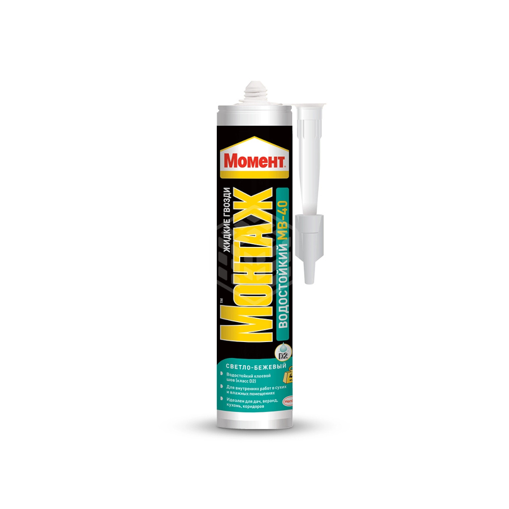 Клей Момент Монтаж, водостойкий, МВ-40, 300 г представляет собой универсальный водостойкий клей высшего качества. Обладает классом водостойкости D2 согласно DIN E 204. Области применения: различные породы дерева, МДФ, ДСП, гипсокартон, пробка, пенополистирол. Одна из склеиваемых поверхностей должны впитывать воду. Не подходит для для полиэтилена, полипропилена, тефлона.
