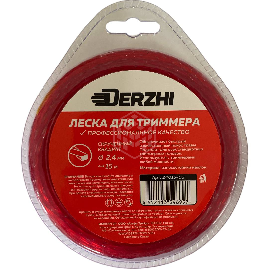 Характеристики товара Леска для триммеров Derzhi, квадрат, 2,4 мм, 15 м, блистер
