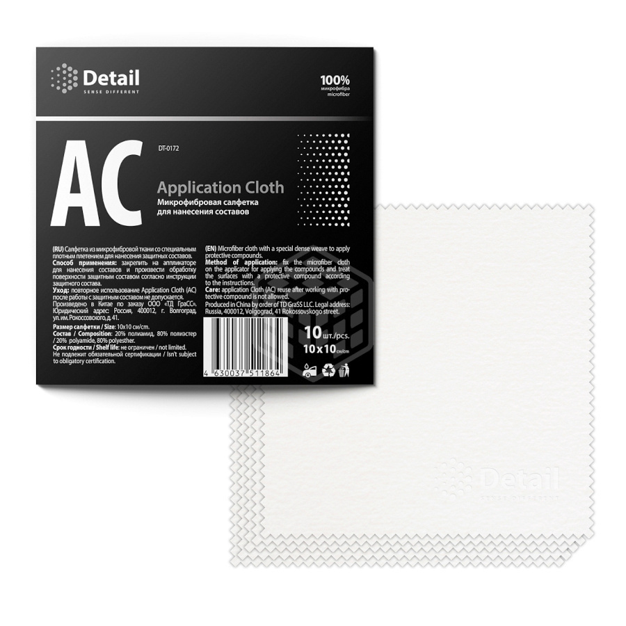 Микрофибровая салфетка Detail Application Cloth, 10х10 см, 10 шт, DT-0172 со специальным плетением для нанесения защитных составов. Состав: 20% полиамид, 80% полиэстер. Способ применения: закрепить на аппликаторе для нанесения составов и произвести обработку поверхности защитным составом согласно инструкции защитного состава.