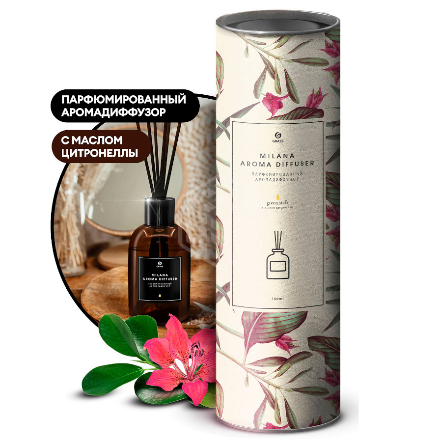 Парфюмированный аромадиффузор Grass Milana green stalk, 100 мл наполнит любое помещение легким шлейфом ароматов. Это изысканная парфюмерная композиция. Богатый и сложный аромат с яркими нотами бергамота, иланг-иланга, гвоздики, кардамона, жасмина и кедра наполнят ваш дом свежестью. Состав: ≥30% метиловый эфир Дипропиленгликоля; ≥15%, но <30% ароматизатор (бензиловый спирт, Бензилбензоат, бензилсалицилат, цитраль, цитронеллол, эвгенол, фарнезол, гераниол, гидроксицитронеллал, изоэугенол, лимонен, линалоол. Способ применения: откройте пробку, вставьте декоративный колпачок и палочки. Интенсивность аромата можно регулировать количеством, а так же пере- ворачиванием палочек.