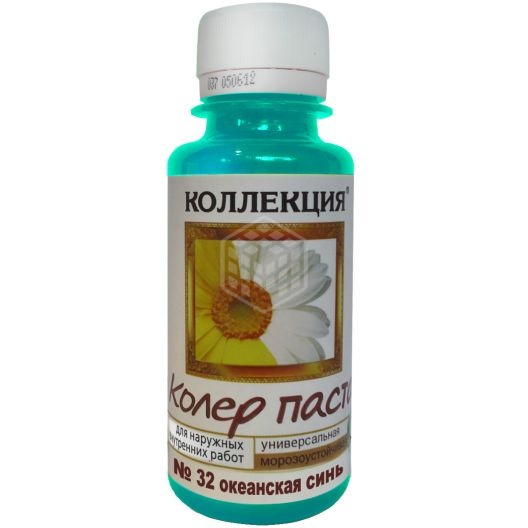 Паста колеровочная универсальная Коллекция, №32, океанская синь, 0,1 кг является специальным средством для колеровки различных лакокрасочных материалов, среди которых краски, эмали, побелочные растворы, лаки, лазури для дерева, штукатурки, затирки на вододисперсионной и органической основах. Паста отличается повышенной морозоустойчивостью (выдерживает до 5 циклов заморозки - разморозки). Колер рекомендуется добавлять в объёме, не превышающем 5% от общего количества лакокрасочного материала, если материал базовый, то можно добавлять не более 10%. Чтобы получить равномерную интенсивность при покраске поверхности, необходимо сразу тщательно перемешать весь покрасочный материал. Данная паста применяется при внутренних работах и при фасадных, не используется, как самостоятельное покрытие. Хранить ее нужно в таре при температуре от -50°С до +50°С. Перед применением пасту необходимо перемешать, хорошо встряхнув флакон, затем небольшой объем колера ввести в некоторое количество краски или эмали, и только затем добавить полученную смесь в основную массу.