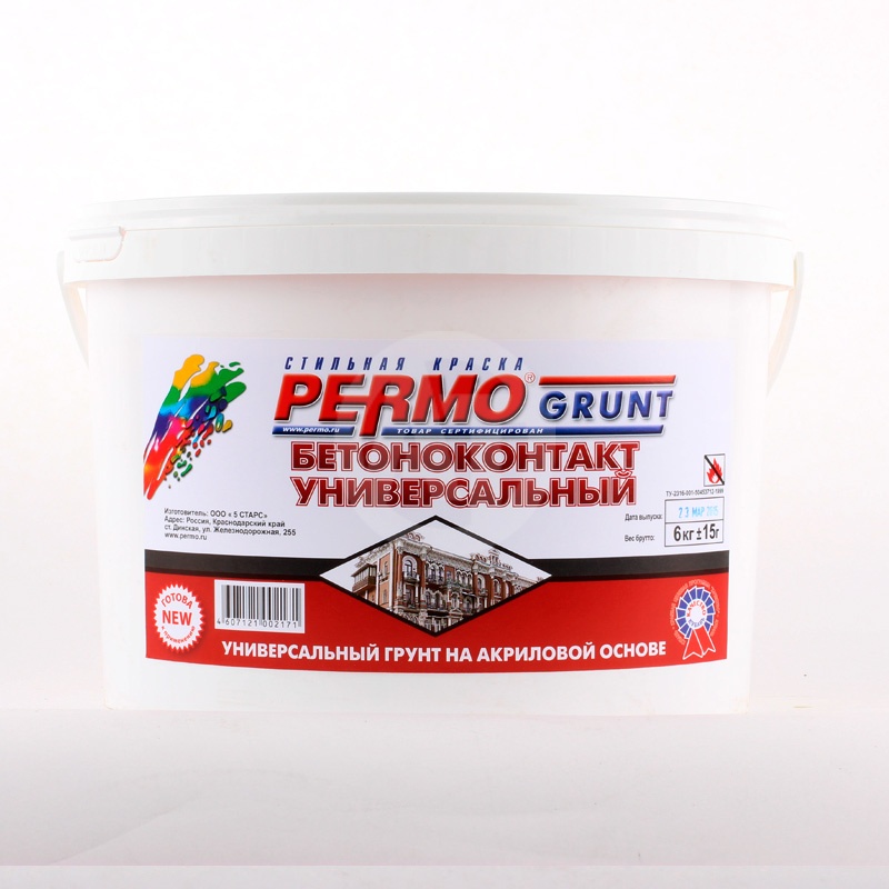 Характеристики товара PERMO грунт Бетоноконтакт универсальный на акрил.основе 6 кг