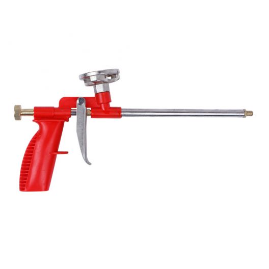 Пистолет для монтажной пены Derzhi, металлический корпус предназначен для проведения работ с профессиональной монтажной пеной. Перед применением необходимо встряхнуть баллон с пеной и удалить с него закрывающую пробку в соответствии с инструкцией на баллоне. Накрутите баллон на резьбу адаптера без излишних усилий. Во избежании вытекания пены накручивайте баллон быстро. Вытекшую пену немедленно удалите растворителем. Регулировать расход пены позволяет регулировочный винт. Что бы заблокировать курок и перекрыть сопло следует повернуть винт по часовой стрелке до упора. Для перерывов до 3 часов баллон с пеной можно оставить прикрученным к пистолету, а по окончанию или перерыву более 3 часов баллон необходимо снять и тщательно очистить пистолет.