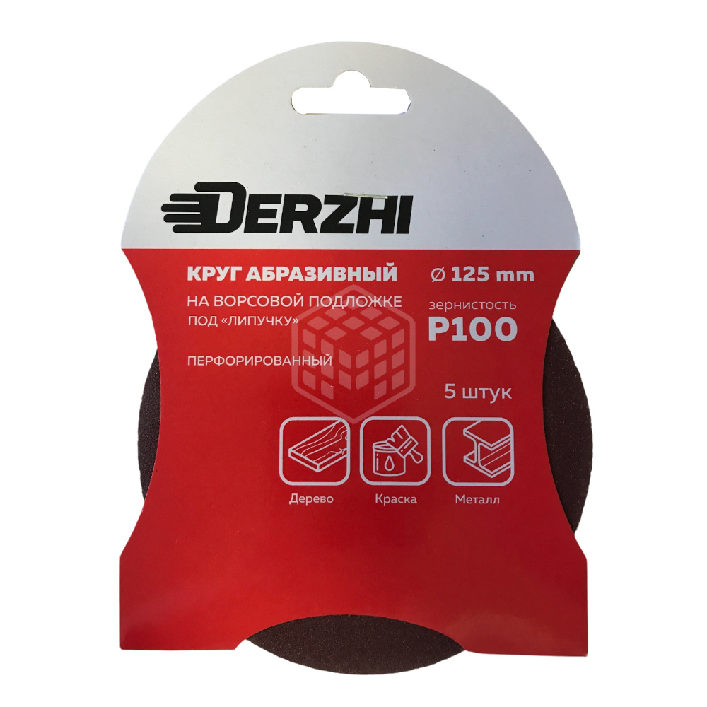 Характеристики товара Шлифкруг Derzhi, Р100, перфорированный, под липучку, 125 мм, 5 шт