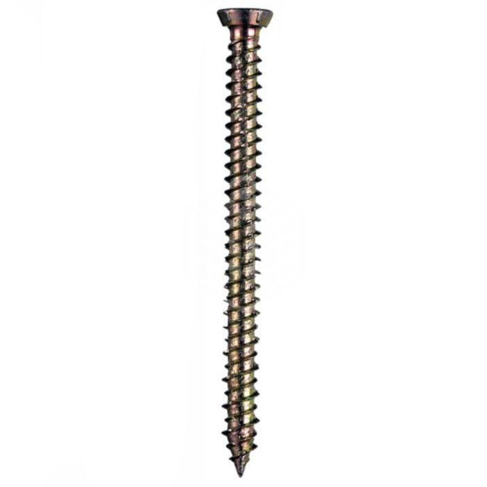 Шуруп по бетону, потайной, цинк, 6х80 мм, 100 шт имеет очень острый наконечник, переменную резьбу и насечки по всей длине, облегчающие врезание в материал. Изготавливается из прочной стали, которая предварительно закаливается, а затем покрывается цинковым сплавом. Слой желтого цинка значительно увеличивает срок службы изделия, защищает от окисления. Предназначен для монтажа дверных порталов, оконных рам, деревянных планок к полнотелым строительным материалам (кирпич, бетон).