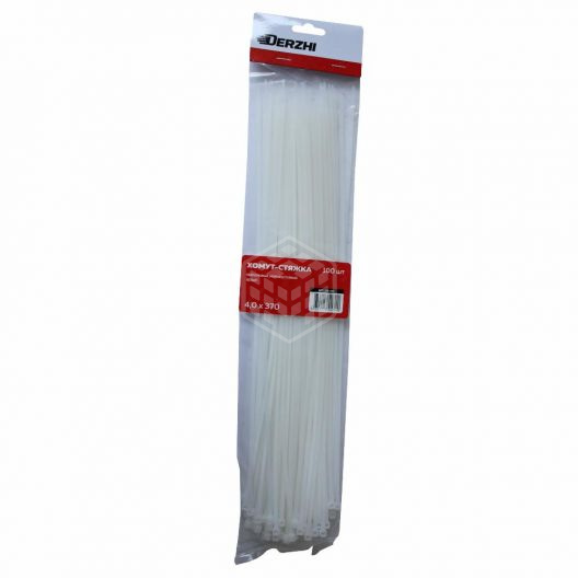 Хомут-стяжка Derzhi КСК, 4х370 мм, с кольцом под винт, нейлоновые, белые, 100 шт