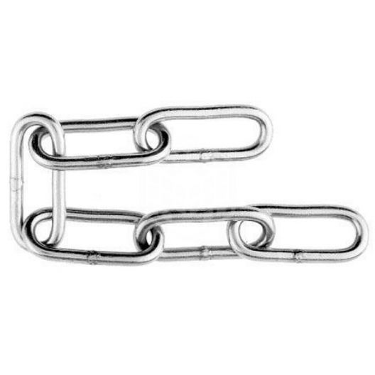 Цепь сварная, длиннозвенная, оцинкованная, 4 мм представляет собой специальный элемент различных механизмов и оборудования для подъема и перемещения различных грузов небольшой массы. Цепь сварная широко применяется в различных грузоподъемных устройствах, от ручных талей до подъемных кранов, для подъема и перемещения деталей и элементов конструкций, а также в качестве растяжки. Размер изделия определяется диаметром прутка звена цепи. Она изготовлена из отдельных сваренных овальных оцинкованных стальных звеньев, скрепленных между собой и имеет один сварной шов. Данную цепь не рекомендуется использовать при наличии ударных нагрузок.