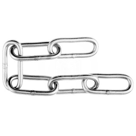 Цепь сварная, длиннозвенная, оцинкованная, 6 мм, 18 м ат состоит из звеньев овальной формы, соединенных между собой. Изготовлена из углеродистой стали, оцинкована. Цепь имеет большую степень свободы, ограниченную одним звеном. Длиннозвенная цепь хорошо работает в качестве растяжки. Позволяет регулировать длину цепи. За счет большой длины звена легко крепится, при необходимости укорачивается, позволяет сделать петлю методом "звено в звено". Не выносит ударных нагрузок.