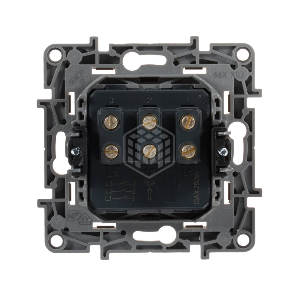 Выключатель для вкл/выкл 3-х нагрузок до 10А 250В (2500 Вт), имеющих одну линию питания. Подключение проводов - на винтах.